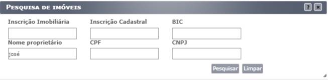 Essa funcionalidade permite a consulta a partir de atributos específicos – Inscrição Imobiliária, Inscrição Cadastral, BIC, Nome proprietário, CPF e CNPJ (Figura 2).