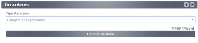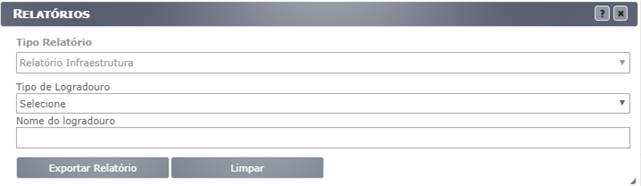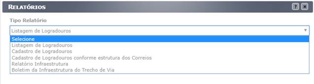 São os seguintes relatórios gerados: Listagem de Logradouros, Cadastro de Logradouros, Cadastro de Logradouros conforme estrutura dos Correios, Relatório Infraestrutura e Boletim da Infraestrutura do Trecho de Via (Figura 12).