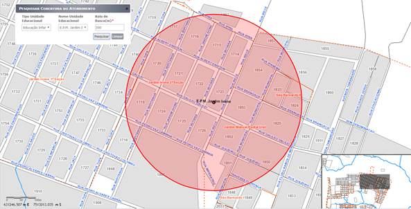 A funcionalidade de visualização de cobertura de atendimento, a partir de unidade educacional específica e utilizando um raio de busca gerado dessa unidade, se obtém um resultado visual de abrangência (Figura 6).