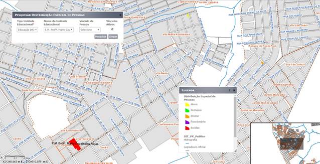 Essa ferramenta mostra uma análise espacial interessante: onde estão as pessoas associadas à respectiva unidade educacional? Com base nos filtros existentes da pesquisa – Tipo Unidade Educacional, Nome da Unidade Educacional e Vínculo da Pessoa – se visualiza a unidade educacional e o endereço onde a pessoa associada cadastrou (Figura 7). No exemplo da Figura 7, o resultado em amarelo apresenta aluno associado à unidade educacional respectiva.